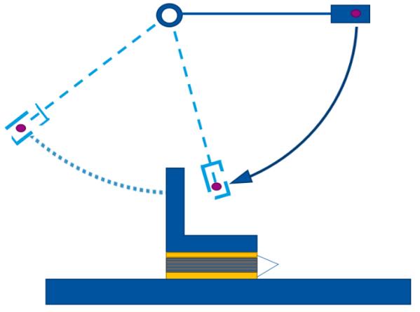 內(nèi)結(jié)合強(qiáng)度測定儀如圖2所示,它包括裝在底座上的擺,擺動軸裝在球或類似低摩擦軸承的兩點上,擺的重心距離軸的中心線(127.0士0.6)mm,擺從水平位置開始至少可自由旋轉(zhuǎn)180°,擺上的撞擊球應(yīng)在豎直方向時撞擊金屬平砧;一個鎖緊裝置,可將擺固定在水平位置上,并能滿足擺瞬間釋放的需要;試樣組件,一個固定的金屬平砧和一個可分離的直角金屬平砧(在橫截面上呈直角);機(jī)械式或電子式記錄裝置,當(dāng)擺被釋放,并擺過垂直位置時,記錄擺動的最高位置。儀器的測量范圍應(yīng)為0J/m2~525J/m2。