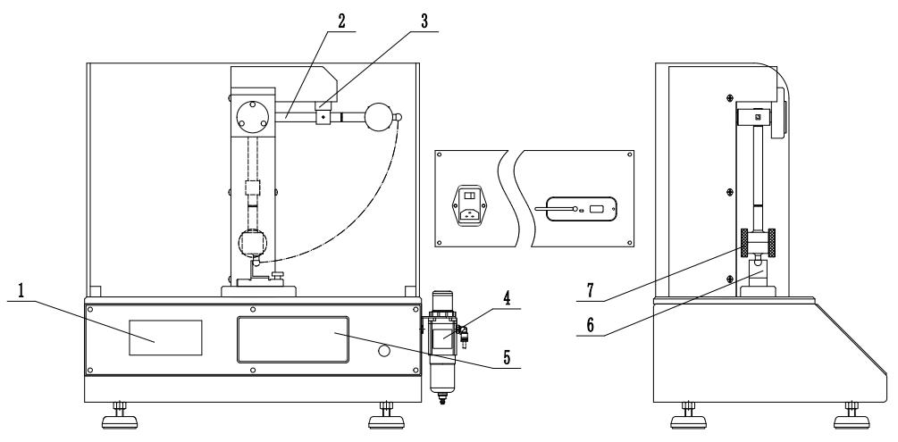 1-打印機(jī) 2-擺 3-鎖緊裝置 4-調(diào)壓閥 5-顯示屏 6-金屬平砧 7-配重塊
