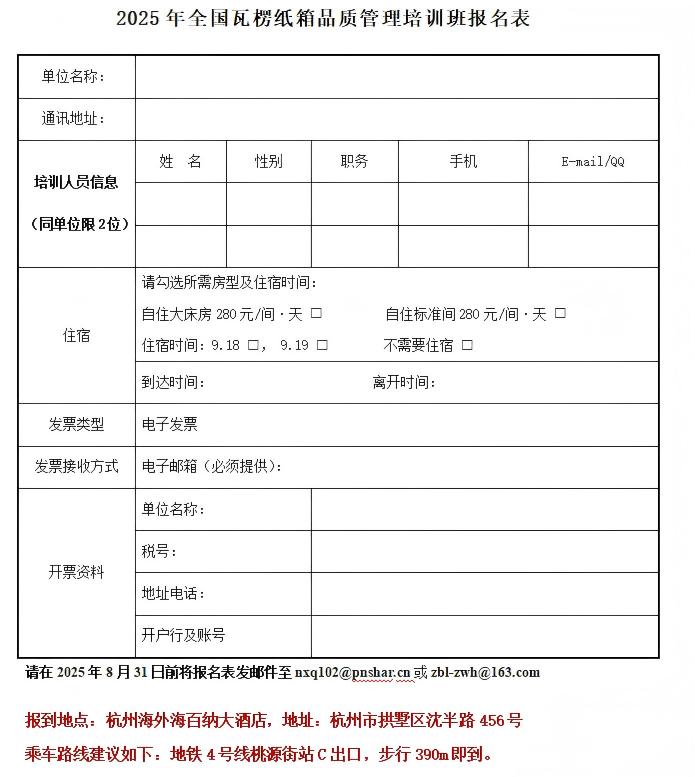 為了提高紙包裝行業(yè)的產(chǎn)品質(zhì)量管理水平,幫助企業(yè)更好地適應(yīng)紙包裝用戶對紙包材品質(zhì)管控需求,進一步提高包裝生產(chǎn)、質(zhì)檢、研發(fā)、質(zhì)量監(jiān)督檢測等崗位的技術(shù)業(yè)務(wù)能力,中國包裝聯(lián)合會紙制品包裝專業(yè)委員會聯(lián)合杭州品享科技有限公司、杭州衡正檢測技術(shù)有限公司,將于2025年9月18日—20日在浙江杭州舉辦“2025年全國瓦楞紙箱品質(zhì)管理培訓班”,現(xiàn)將相關(guān)事項通知如下: